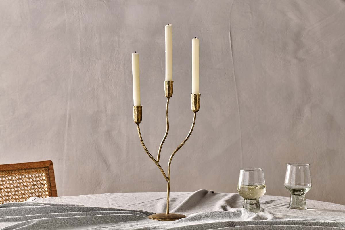 Made from cast aluminium, this Palani candelabra makes a striking centrepiece that brings a flourish to any table. Our antique brass threecandle candelabra is made by first pouring molten metal into a cavity of packed sand, and then, when cooled, breaking the metal cast out of the sand to reveal its beautiful organic shape, inspired by spring flowers. Naturally elegant with fluid lines and a sculpture-like quality, this timeless piece fits with all interior styles. Please note, it is also available in a larger five-candle design. Style with our dinner candles.
