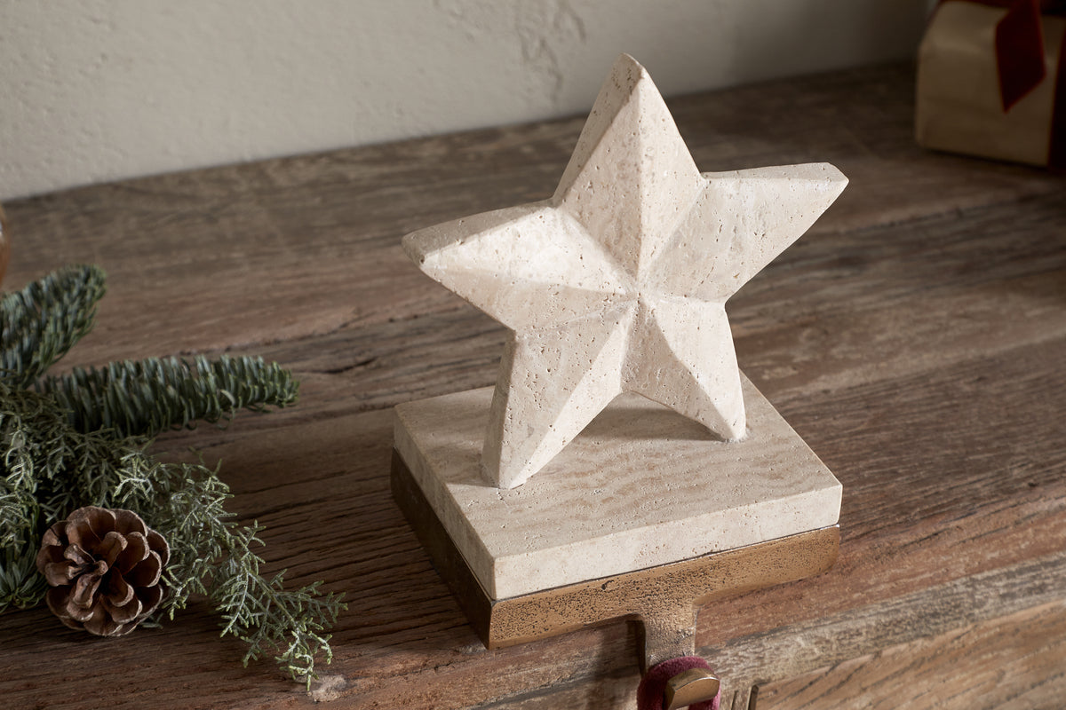 Inspired by the enduring symbolism of the Christmas star, the Malaati stocking holder offers a grounding presence in festive décor. Carved from solid travertine stone, it brings natural elegance and quiet strength to the mantelpiece. The creamy beige tone, paired with warm brass detailing, strikes a balance between refined and rustic. With its simple silhouette and considered materials, it’s a timeless piece that supports your seasonal traditions with understated style.
