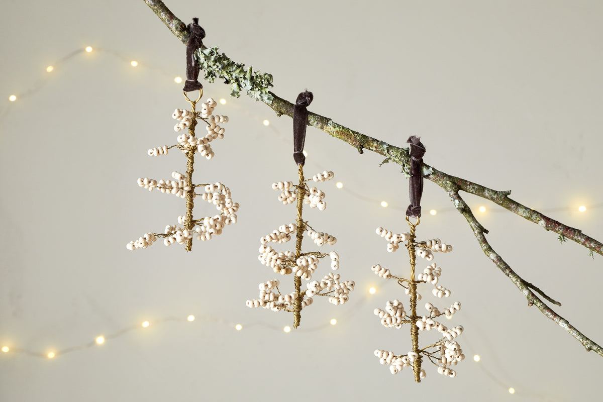 With a form that echoes the shape of a Christmas tree, these decorative baubles combine mango wood beads and antique brass-coloured wire in a delicate, foliage-inspired design. Their soft texture and warm tones add a natural elegance to festive trees, garlands, or table settings.