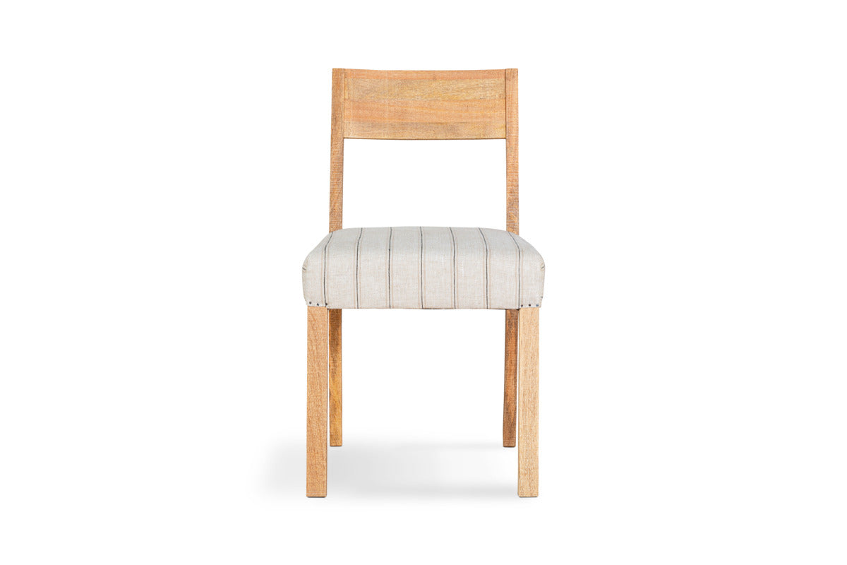 The Nidhi dining chair brings refined comfort to your dining space with a blend of natural materials and tactile charm. Crafted from solid mango wood with a rough-sawn finish that enhances its organic texture, the frame is paired with soft natural linen upholstery featuring a subtle charcoal stripe. This timeless design adds pattern and elegance without overpowering, making it a versatile addition to classic or contemporary settings.