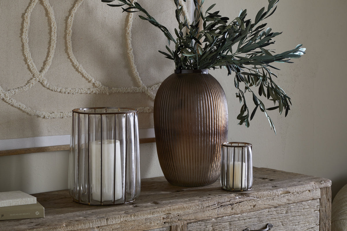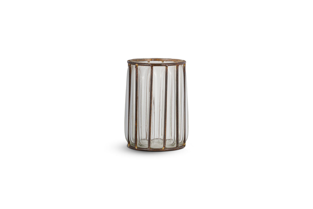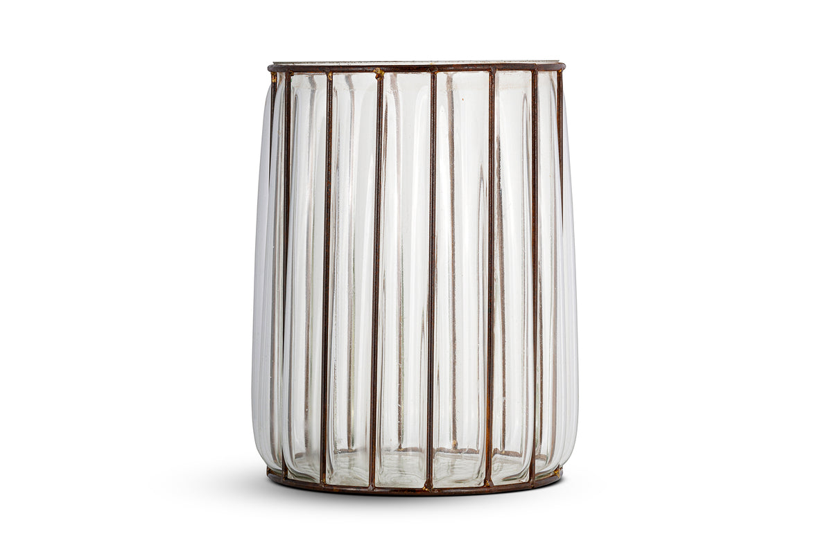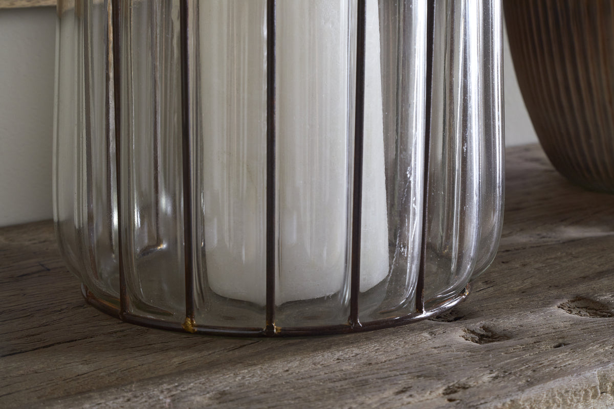 Each holder starts with a hand-formed iron structure, shaped to create a cage-like frame. Molten glass is then poured and blown into this frame, taking form within the metalwork. Once cooled, the iron is treated with a rustic antique brass finish, enhancing its aged character and ensuring every piece is slightly unique.