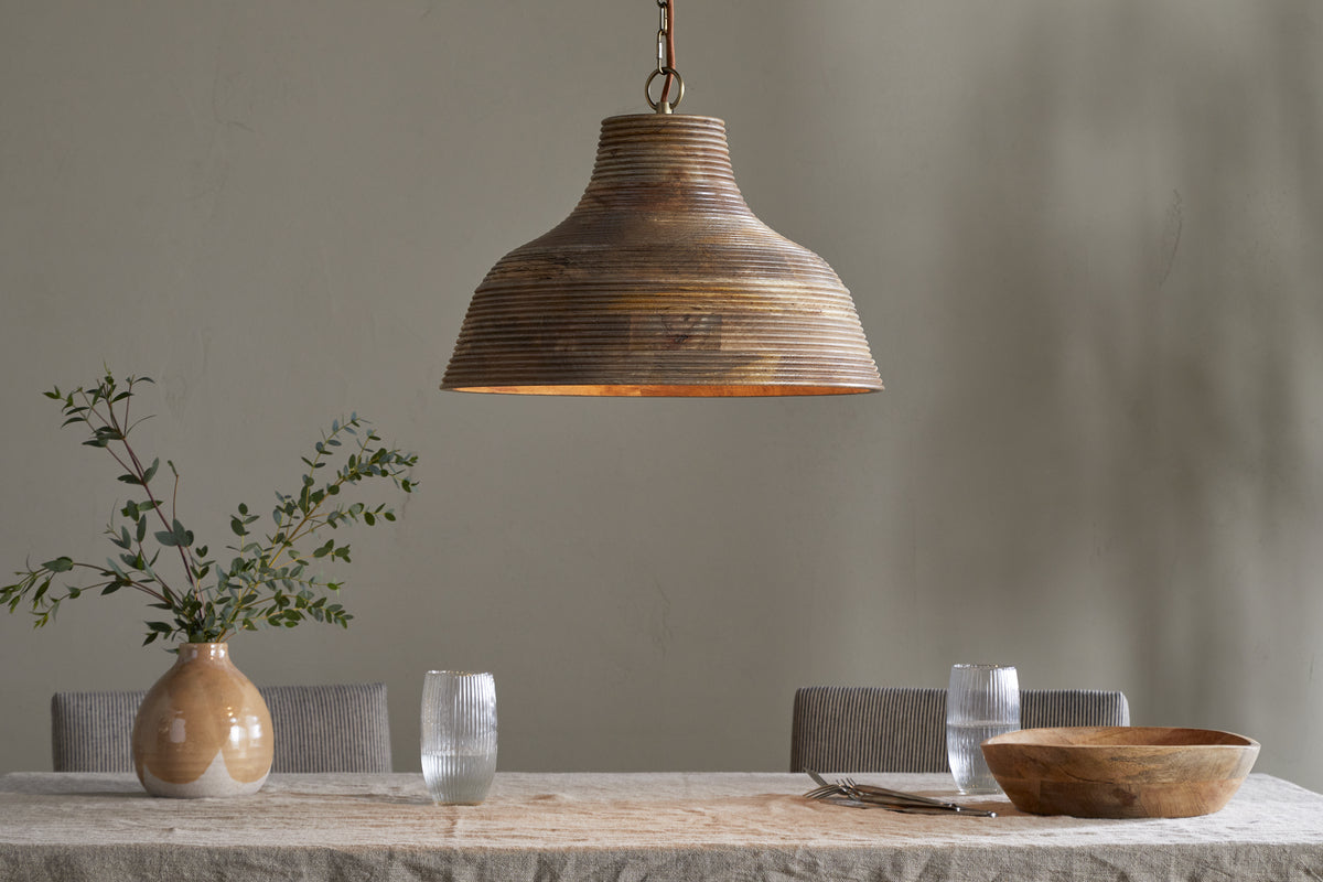 The Nadi grooved wood pendant blends natural warmth with refined character. Designed to complement both classic and contemporary interiors, its clean silhouette and ribbed wooden surface bring depth and texture to kitchens, bedrooms, or living spaces. Suspended from an antique brass chain, the mango wood pendant adds a grounded elegance to any ceiling setting, striking a balance between functional lighting and thoughtful design.