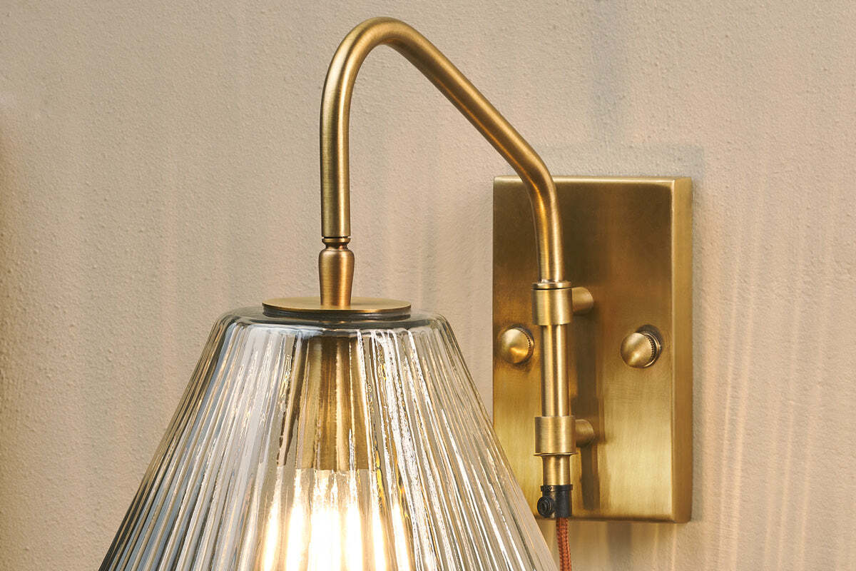 Our Akoli Glass Wall Lamp has a delicately fluted glass shade which diffuses the light softly and brings a beautifully warming glow to a bedside or living space. Contrasted by the muted elegance of the antique brass neck and base plate, and a rust cable for a nkuku finishing touch, it's a charming light with a timeless look. This wall lamp is a quick and simple way to bring stylish lighting to a room without needing to rewire or call an electrician.