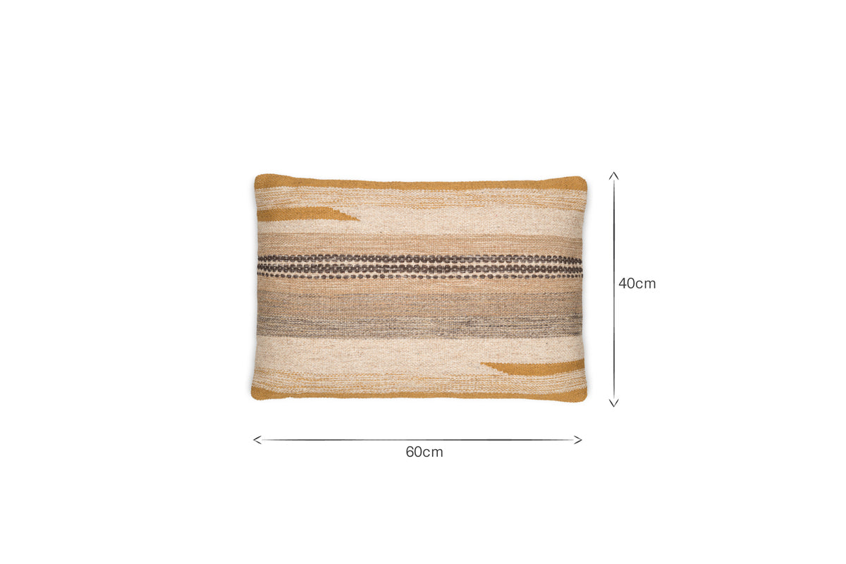 Woven from a blend of wool and recycled polyester, this cushion cover is both beautifully made and consciously designed. The recycled polyester is created from repurposed plastic waste, helping to reduce pollution and give new life to discarded materials. Crafted on traditional Indian looms by skilled makers, the fabric features a rich ochre palette and an intricate woven design.
