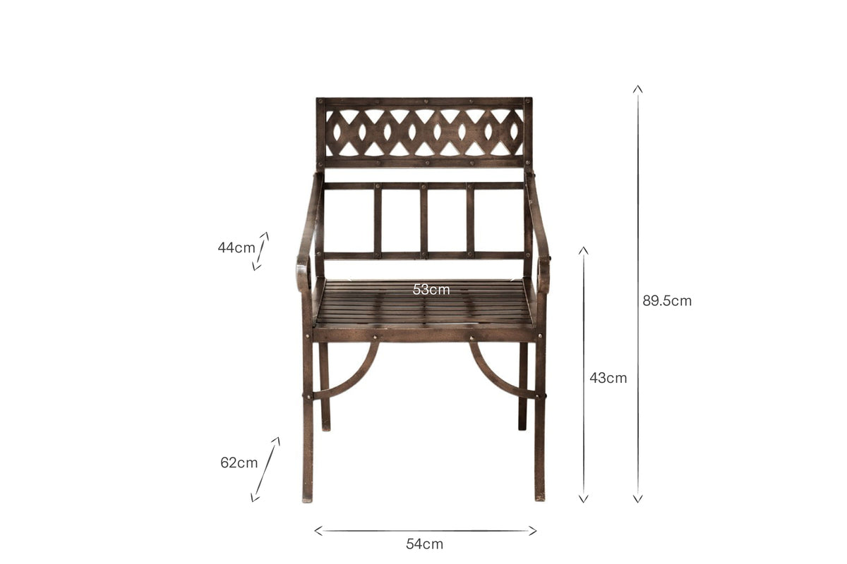 The generous proportions of the Bahula decorative iron chair add to its appealing design, as well as making it a comfortable garden chair. The eye-catching, interlacing pattern on this chair's back and its straight slat seat are enhanced by the warm rust tones of the iron. The iron has a tactile, smooth, finish and feels sturdy and long lasting. We recommend styling the Bahula chair with a scatter cushion for added comfort.