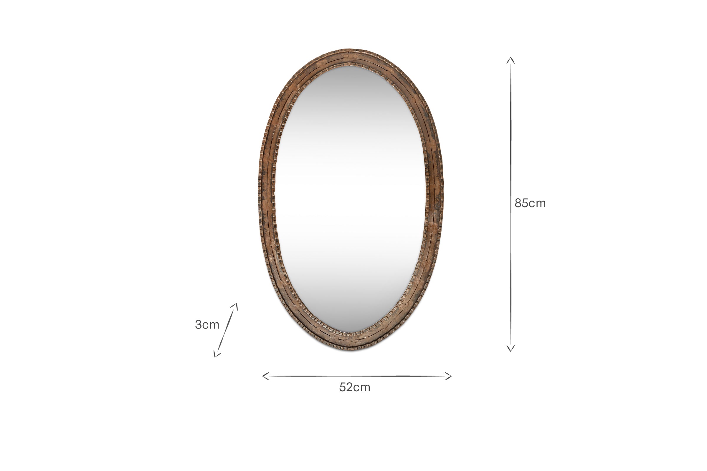 The Drishti mirror has a uniquely handcrafted design etched into the mirrors edge. The heavy iron frame has a rustic, antique black finish that adds a bold touch to interiors, bringing light and a sense of space to even the darkest day. The oval shape works well in any living space, bedroom or hallway. Available in two sizes.