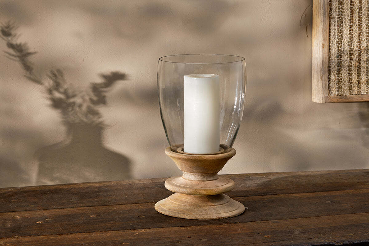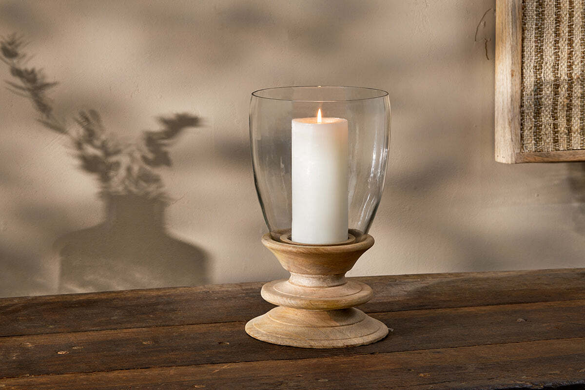 The Eluru lantern brings elegance and style to a table or sideboard. The generous glass lantern top sits perfectly in the hand turned mango wood base. The simple design blends perfectly with the warm natural tones of the mango wood. We use recycled glass to make these collections. Firstly, the waste glass is collected and washed to remove any impurities; it is then crushed and melted down before being hand blown or placed in moulds to create beautiful new products. View our collection of candles to accompany your lantern.