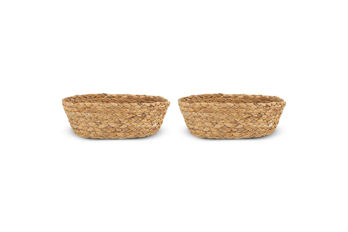 Our set of 2 Giti bread baskets are woven from water hyacinth which is a new natural material for our kitchen and pantry collections. Simply braided with handles for serving, this versatile basket is as happy storing the inevitable kitchen odds and ends as it is serving up bread rolls and cheese crackers. Water hyacinth is a river weed in Vietnam, where these baskets are made, so the local weavers we work with are making ingenious use of an unwelcome species in the ecosystem.