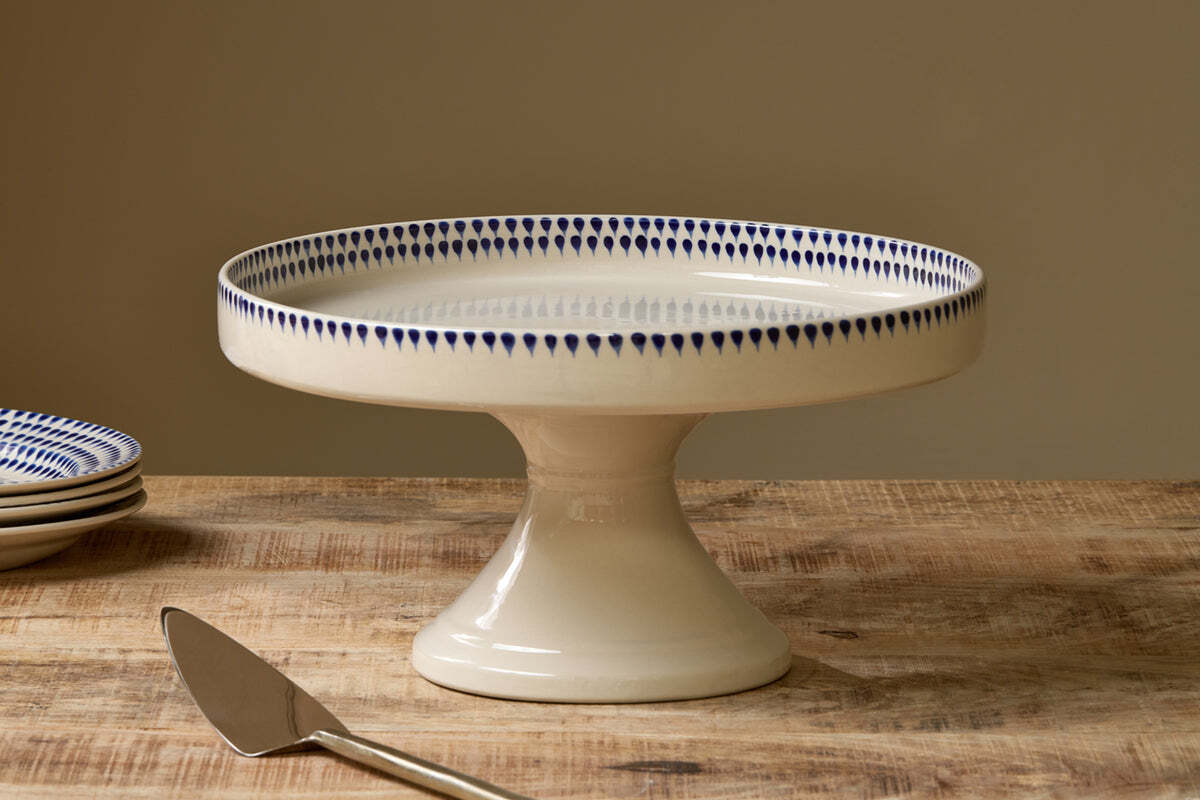 This elegant Indigo Drop ceramic stand is a new addition to our simple yet striking, bestselling ceramics range. The hand painted indigo teardrop details on the interior rim make this piece a lovely addition to any table setting. This stand makes a striking centrepiece, perfect for displaying cakes and sweet treats, but equally would work well as an elevated cheese platter. The simple, sturdy design makes this an understated and timeless classic that fits with ease into any kitchen style.