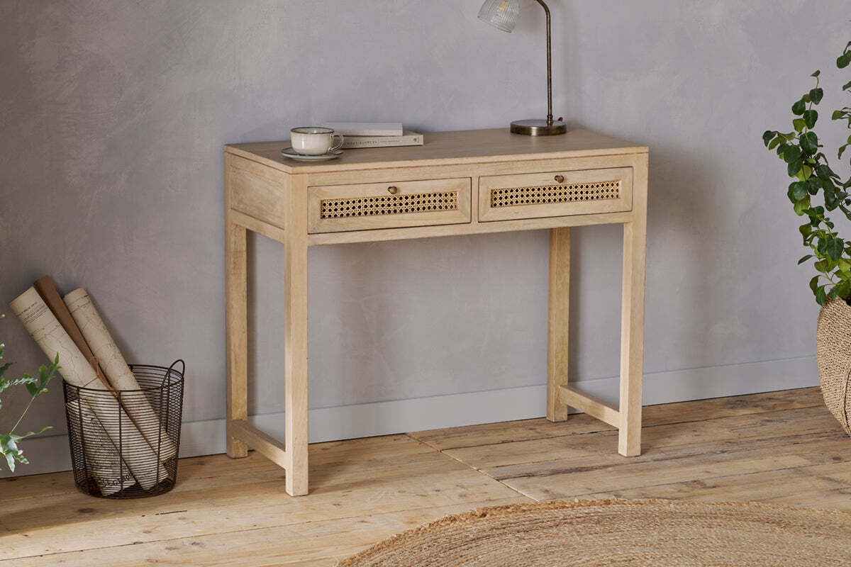 Our Kanz writing table combines a solid mango wood frame with intricately woven cane panels on the drawers for a beautifully detailed finish. The clean, uncluttered aesthetic of this piece makes it a stylish fit for any living space: perfect in a home office, sitting room or bedroom where you need to create a multifunctional area. This table is crafted from mango wood, whereby the trees are only cut down once they have stopped bearing fruit.