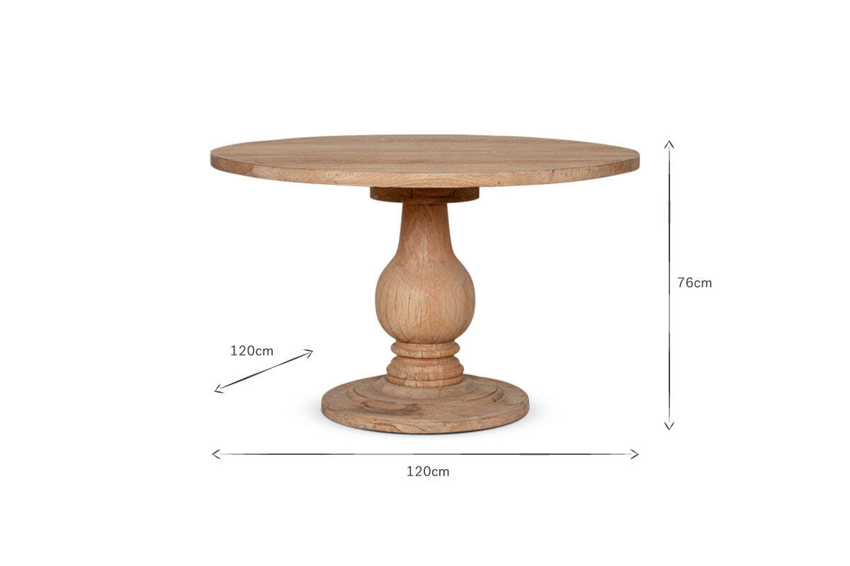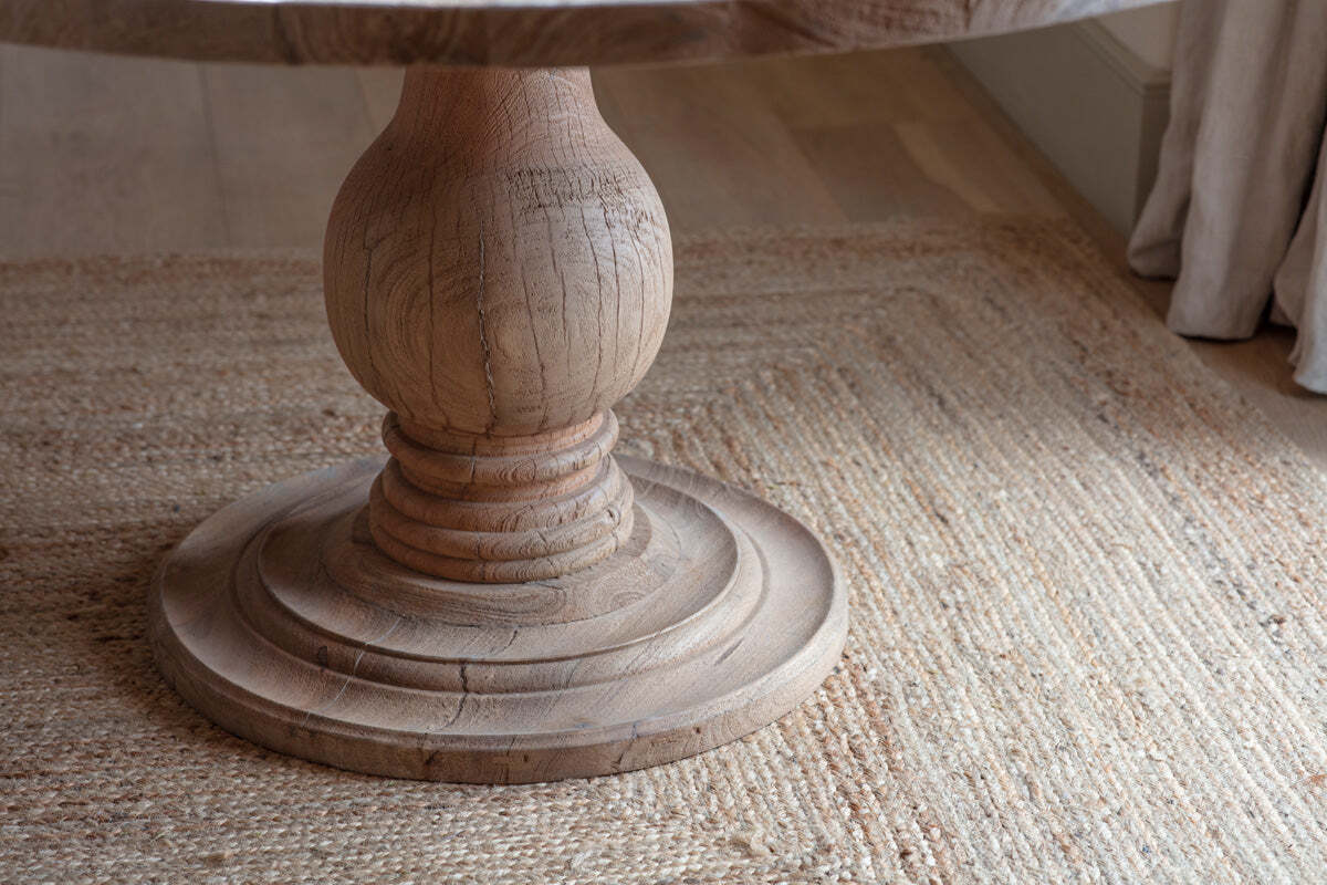 The simplicity and classic style of the 4-seater Laya table make it an effortless addition to a dining room or kitchen space. A beautifully hand-carved piece, the elegant base has a distinctive silhouette that is in harmonious balance with the generous proportions of the tabletop. The grain of the wood and naturally-occurring knots are highlighted in all their beauty with a raw finish that allows the subtle variations in tone, and the tactility of the wood to shine through. We find a circular table feels beautifully informal and creates easy, intimate gatherings.