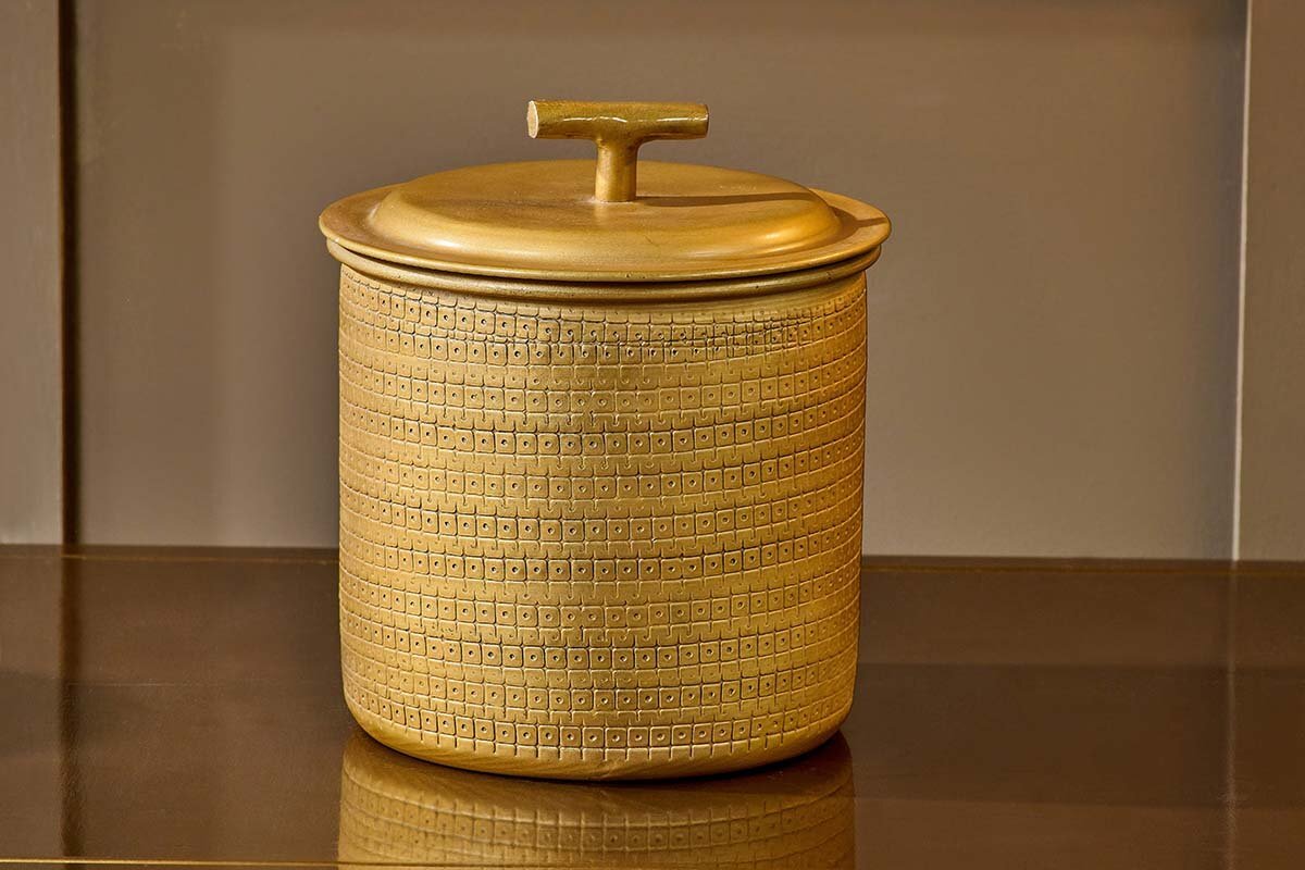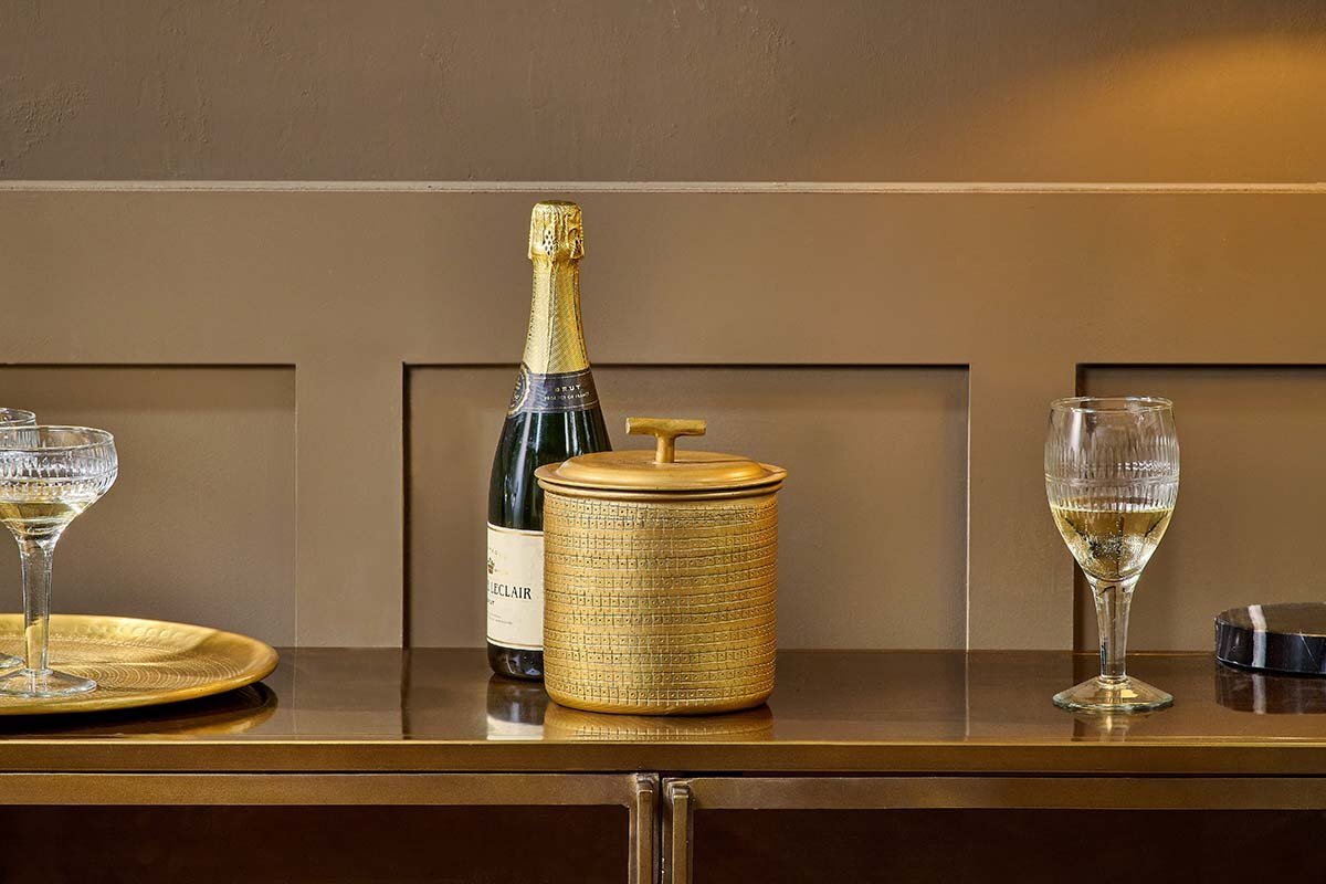 The Nalgora ice bucket and lid marry unique hand-etched patterns with the attractive colour tones of brass. This practical and stylish ice bucket has a simple lid and striking solid bar handle and is the perfect size to slot into a drinks cabinet or fit onto a drinks tray for evening drinks.