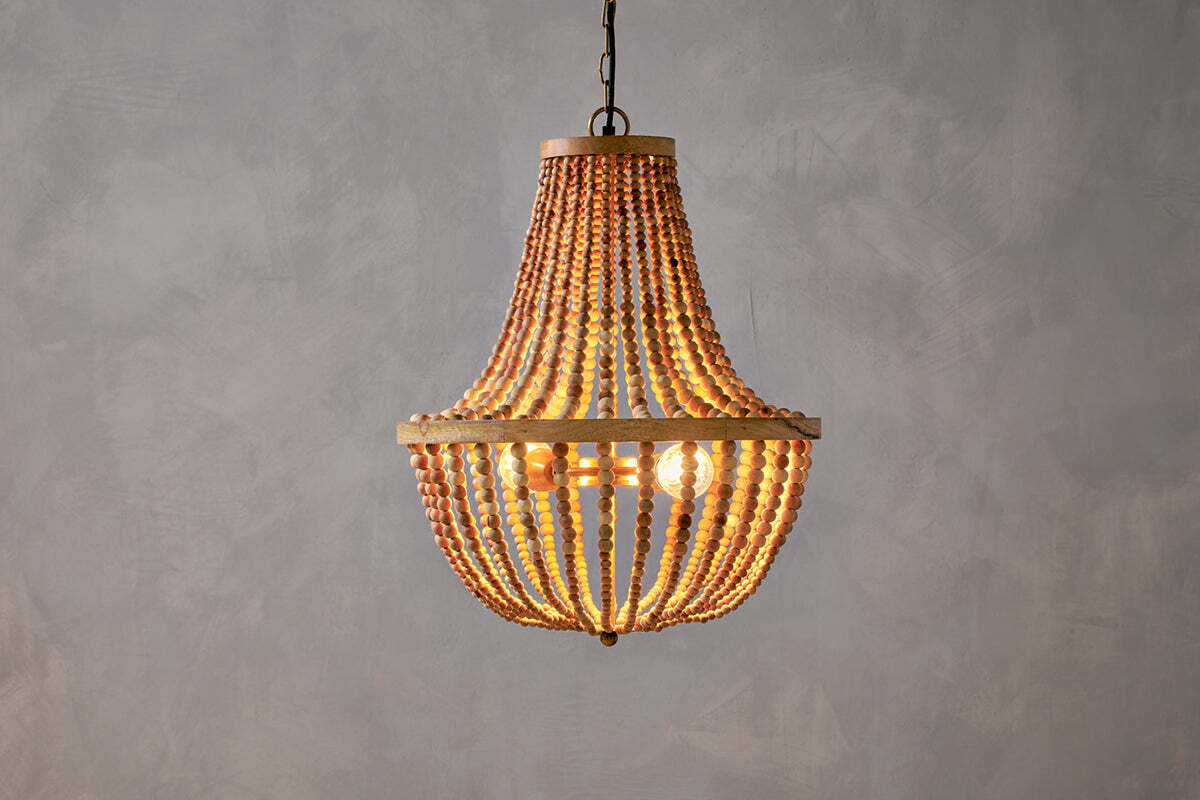 Our Neela pendant creates a beautiful natural statement. This carefully crafted design brings a laid-back, effortless warmth to any living space. It works just as well in a hallway as it does in a conservatory, dining or sitting room. Each wooden bead has been hand-carved and threaded onto strings that are set within a mango wood frame. To avoid waste, we use wood of different colours and textures that bring warmth and added interest to each piece. The antique brass fitting elevates the final look for an utterly unique piece that has been designed to stand out.
