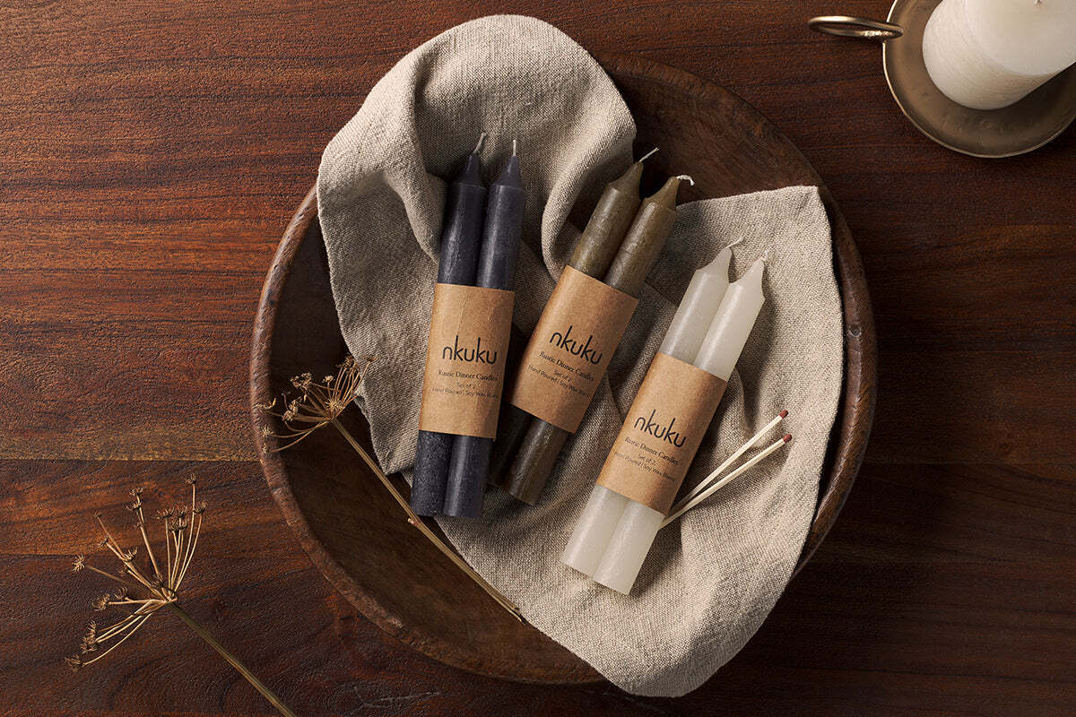 A set of two Rustic dinner candles with a textured finish for a relaxed take on a classic shape. These were designed specifically for our candle holders that fit a tapered style, they look beautiful as a finishing touch on an evening table setting, helping to create a warm and welcoming scene. An elegant 20.5cm in length, made from a soy wax blend and available in a choice of three colours: calm neutral, rich charcoal or warm olive. Candleholder is not included.