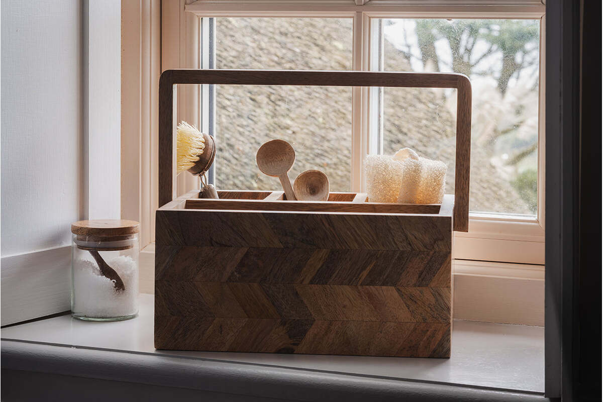 Naturally elegant and beautifully functional, our Sukha caddy is handcrafted from mango wood with our iconic marquetry design and thoughtfully treated to withstand bathroom conditions. We love it for neatly organising your cleaning products or soaps. For longevity, a quick dry-off now and then is recommended. Pair with other items from our Sukha collection for a spa-like bathroom experience.