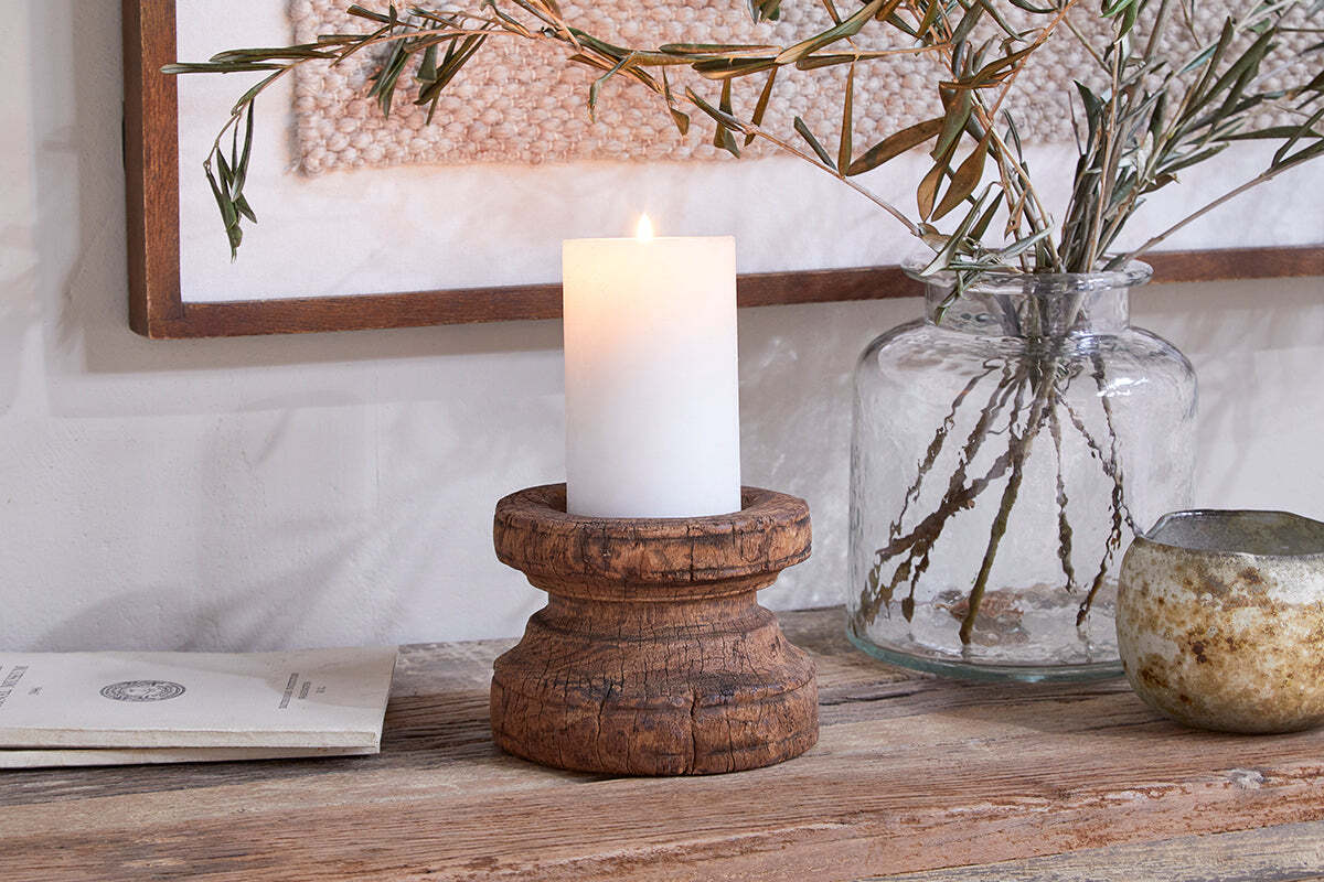 Sourced from local markets in India, our Thoko candle holders have been hand-carved into a decorative shape, making them truly one-of-a-kind. These striking pieces offer a unique and sustainable addition to your home and the perfect conversation piece for a coffee table. Please note that due to their reclaimed nature, candle holders may differ in tones and finish and vary in size by up to 10cm celebrating the individuality of every piece. Available in both round and square designs. Pair with our rustic soy blend Pillar candles.