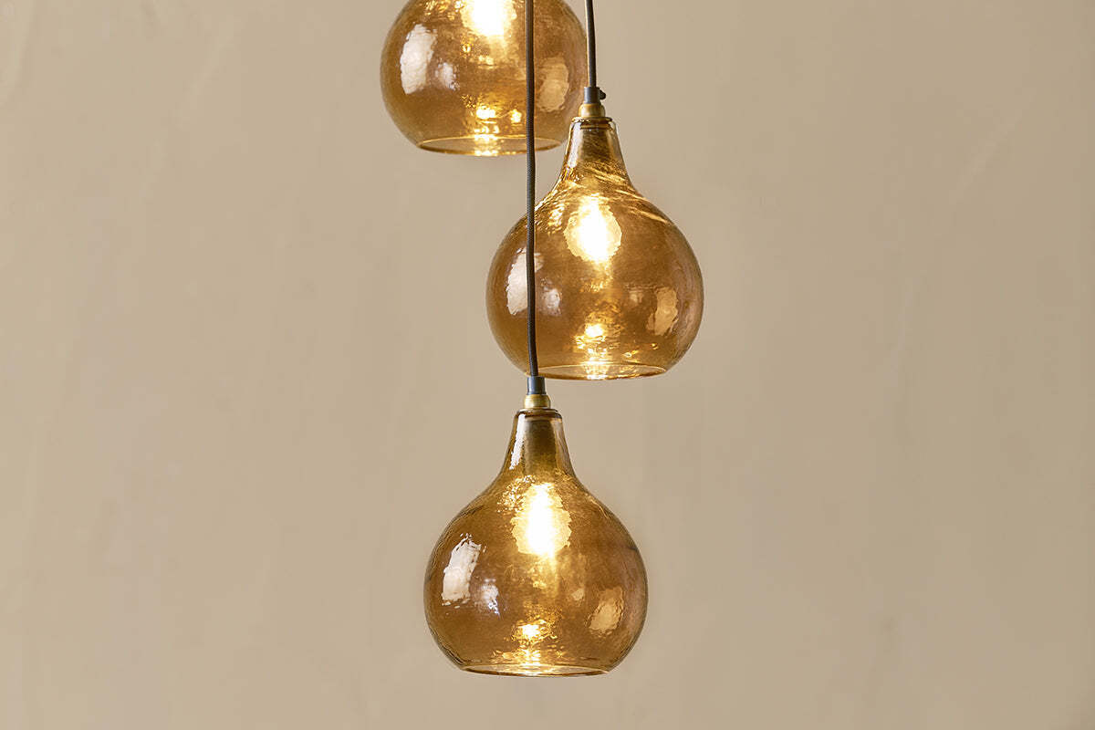 Each glass pendant in this cluster light is hand-blown into an organic, tactile shape, and finished in a smoke brown colour, a perfect neutral palette that imparts softness and warmth whether the bulbs are on or off. Featuring six shades that can be hung at varying heights to fit your specific space, this dramatic arrangement is ideal for high ceilings in dining spaces or hallways. The cluster includes black fabric cables and an aged brass ceiling rose and the recycled glass shades have a hammered finish, making each piece distinctively elegant. This is a beautifully sophisticated fixture that makes an eye-catching addition to your home.